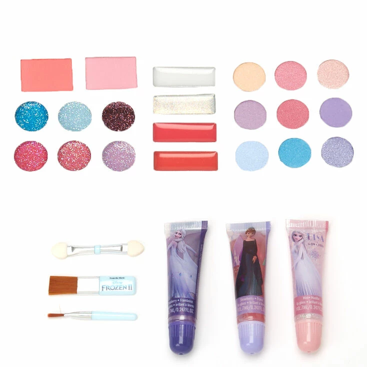 Transform into a pretty princess while wearing some of the makeup in this Frozen 2 set. This set includes 7 lip glosses, 2 blushes, 15 eye shimmers, and 3 applicators.