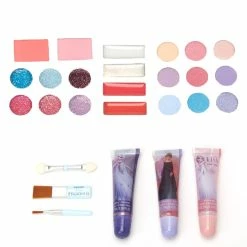 Transform into a pretty princess while wearing some of the makeup in this Frozen 2 set. This set includes 1 lip balm, 4 eye shimmers, and 2 lip glosses in a clear purple purse.