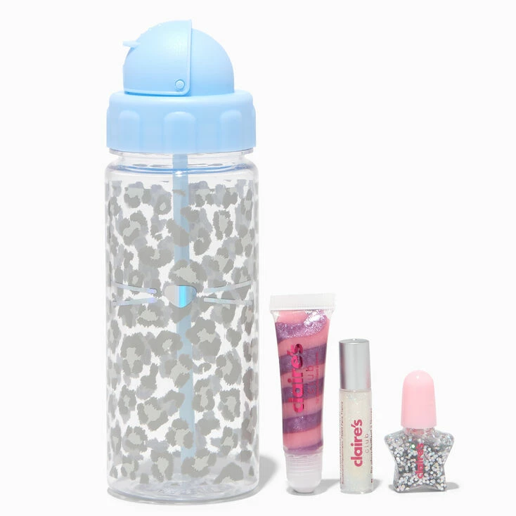 Bring bath time to the next level with this set. The snow leopard-print water bottle comes with 3 glitter products: two lip glosses, and a nail polish.
