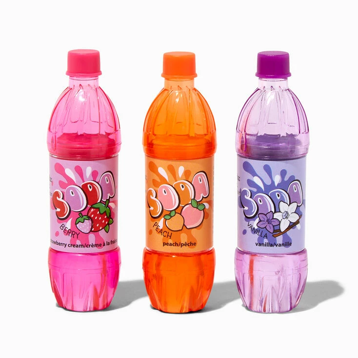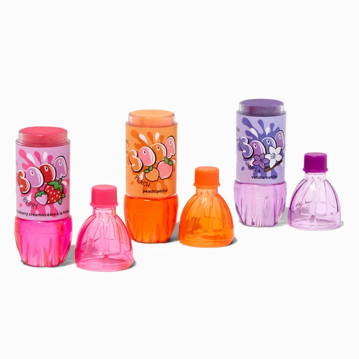 Have fun putting on your lip balm with this cute set! The set includes 3 different flavors of lip gloss in soda bottle-shaped packaging.