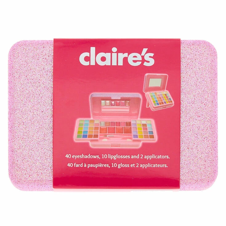 Glittery and girly, this makeup set has 40 bright eyeshadows and 10 shimmery lip glosses in different shades of pink. Also includes a mirror on the inside, a dual-ended sponge tip applicator and a lip brush.